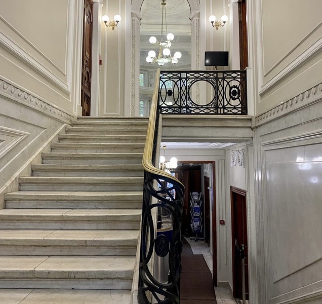 парадную лестницу, украшенную мрамором и кариатидами